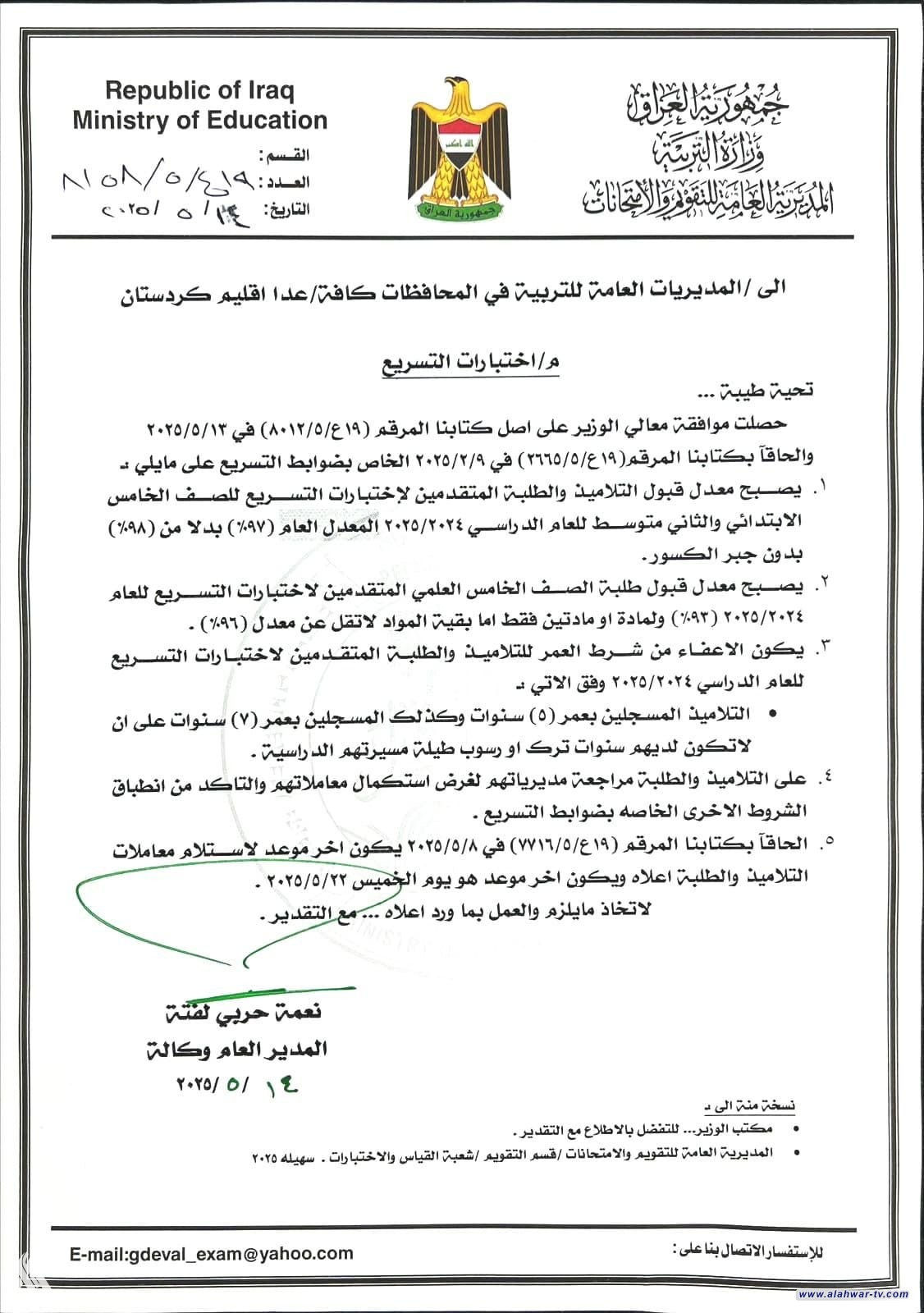 أعلنت وزارة التربية/ المديرية العامة للتقويم والامتحانات، اليوم الأربعاء، عن ضوابط قبول المتقدمين لأداء اختبارات التسريع من تلاميذ الصف الخامس الابتدائي وطلبة الثاني متوسط والخامس الاعدادي (العلمي) للعام الدراسي 2024-2025.