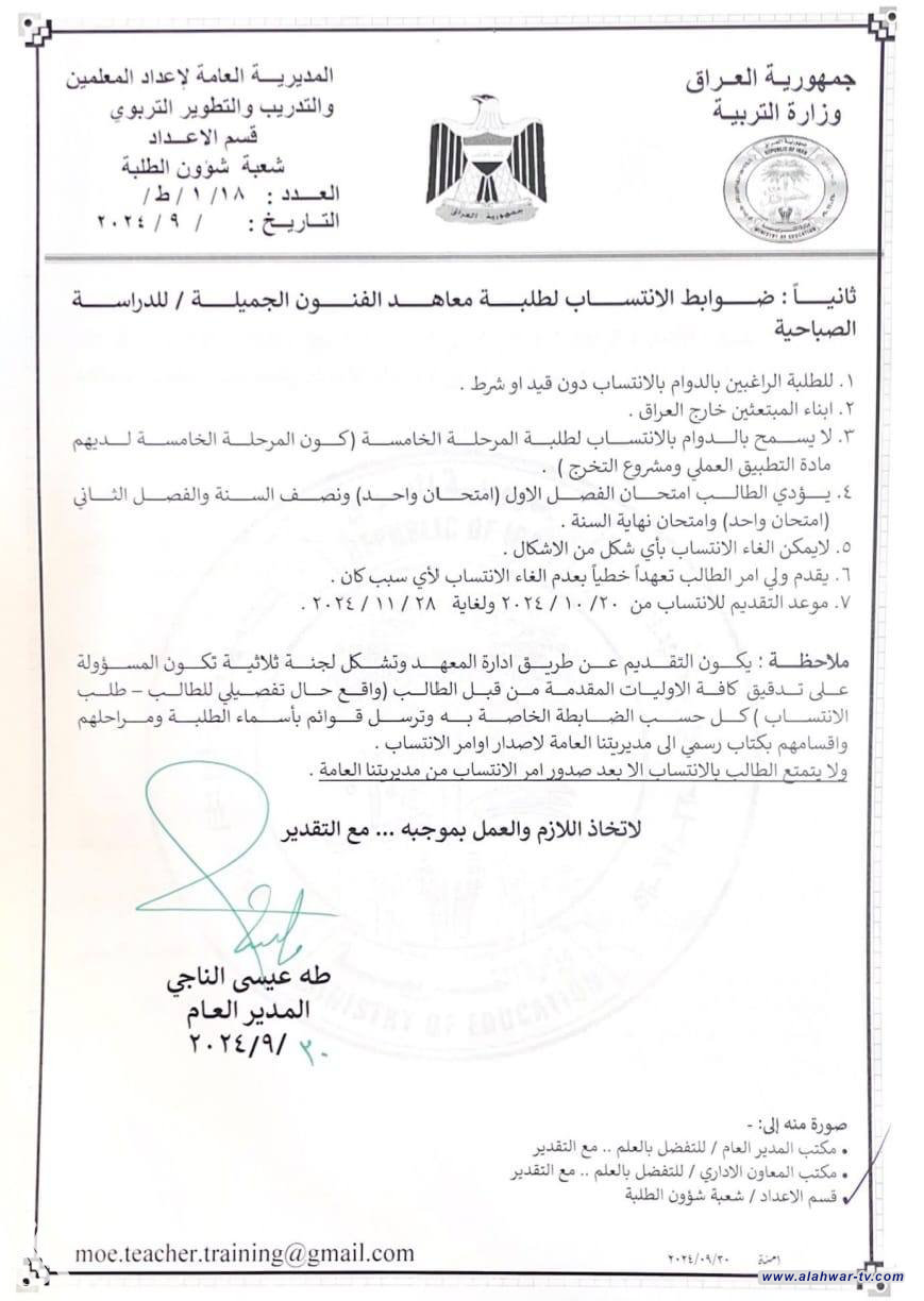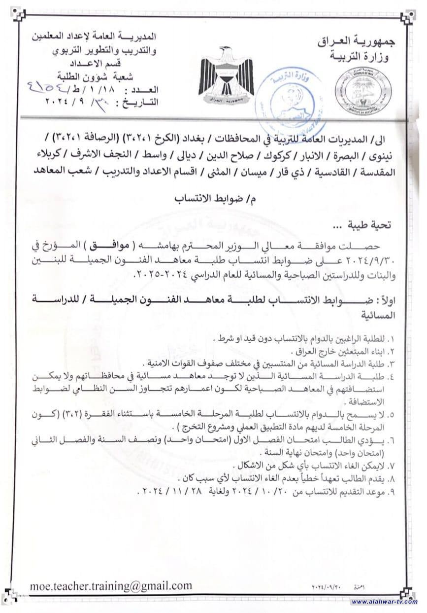 التربية تعلن ضوابط وتعليمات الانتساب لطلبة معاهد الفنون الجميلة