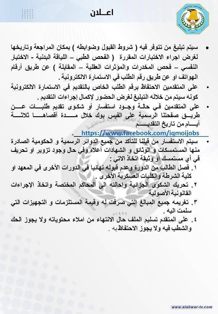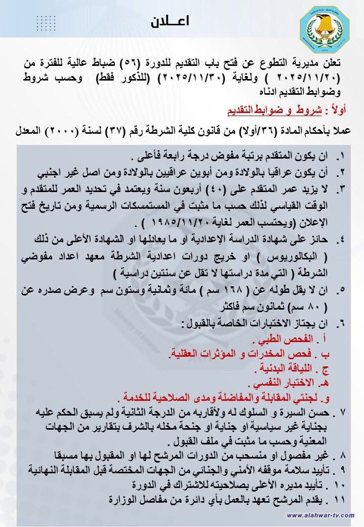 أعلنت وزارة الداخلية، اليوم الخميس، ضوابط وشروط القبول في الدورة (56) ضباط عالية.وذكرت الوزارة في بيان أن ضوابط وشروط القبول في الدورة (56) ضباط عالية كما يلي: