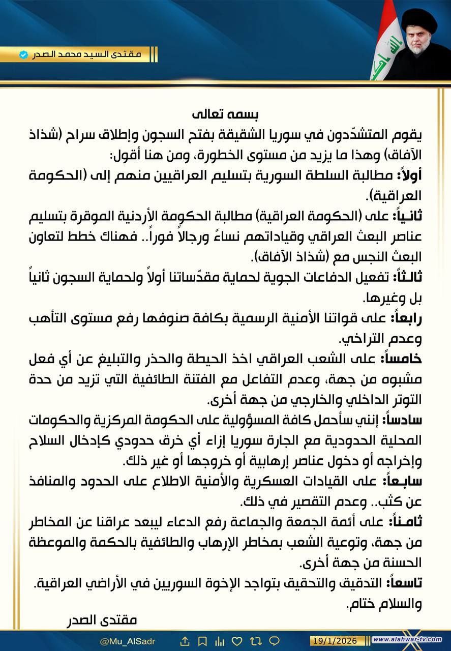 دعا زعيم التيار الوطني الشيعي السيد مقتدى الصدر، اليوم الإثنين، في تدوينة له على منصة (إكس) القوات الأمنية بكافة صنوفها إلى رفع مستوى التأهب وعدم التراخي، وتفعيل الدفاعات الجوية لحماية المقدسات أولاً والسجون ثانياً.