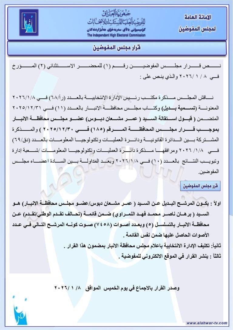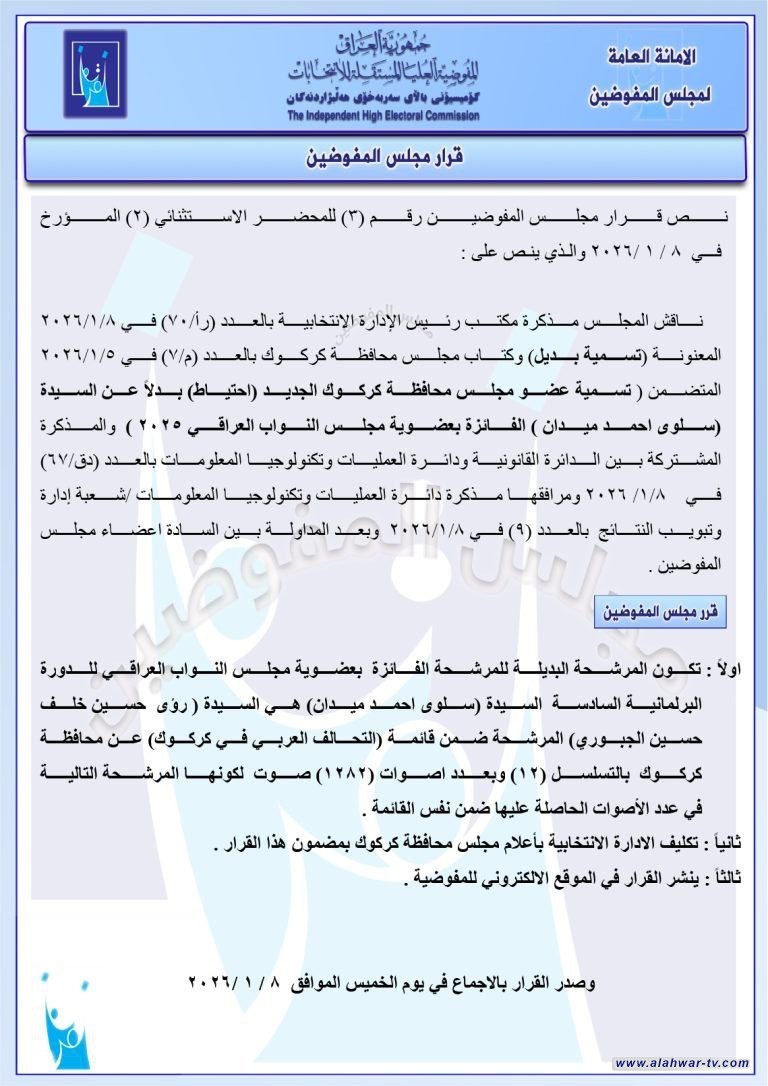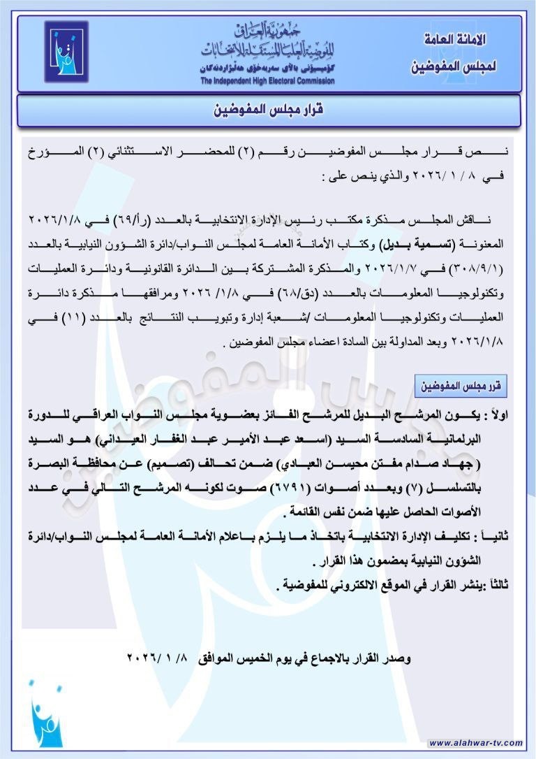 أعلنت المفوضية العليا المستقلة للانتخابات، اليوم الخميس، أسماء ثلاثة مرشحين بدلاء لشغل مقاعد في مجلس النواب، وذلك بعد استكمال الإجراءات القانونية الخاصة باستبدال الأعضاء الفائزين. القرارات أدناه: