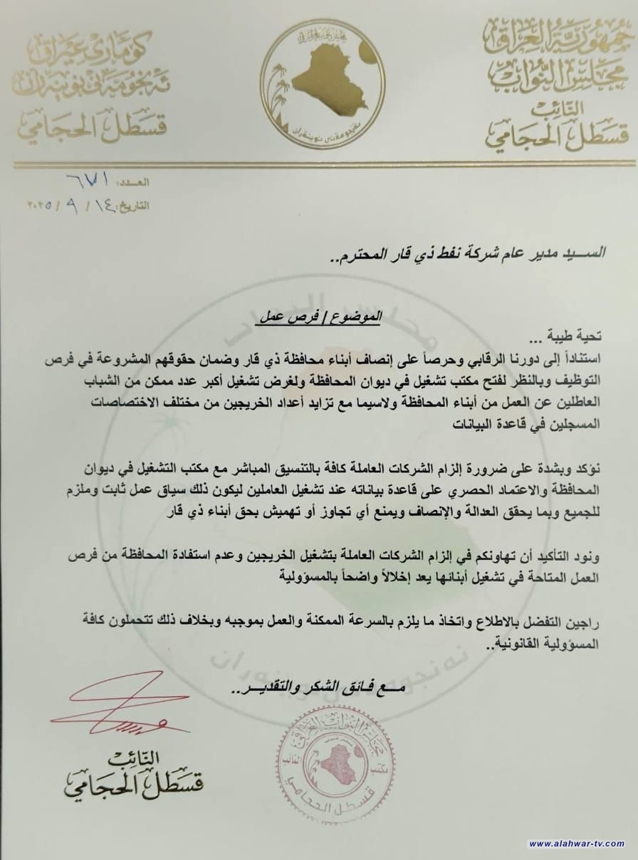 بالوثيقة :النائب الحجامي يدعو نفط ذي قار لضمان فرص العمل لأبناء المحافظة