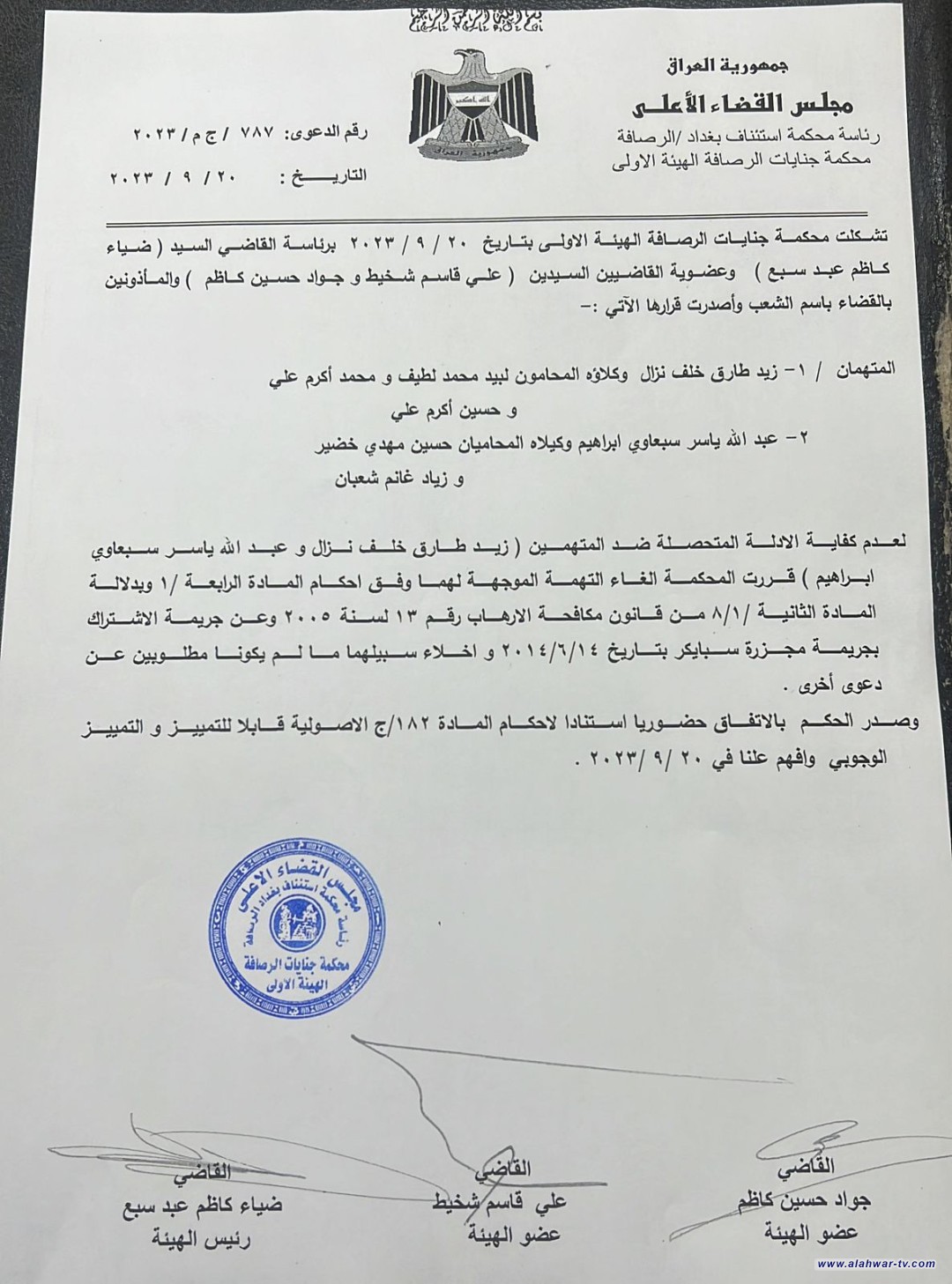 جاء في كتاب رسمي عن مجلس القضاء الاعلى، حصلت عليه وكالة شفق نيوز، أن محكمة جنايات الرصافة الهيئة الاخرى متنوعت بتاريخ 20 واختارت نهائيا ضياء القاضي كاظم عبد السابعة وعضوية القاضيين علي قاسم شخيط وجواد حسين كاظم المأذونين بالقضاء واستقرت قررها لصالحين زياد طارق خلف. نزال وعبد الله ياسر سبعاوي ابراهيم، نجح في تحقيق المساواة المتحصلة ضدهما.