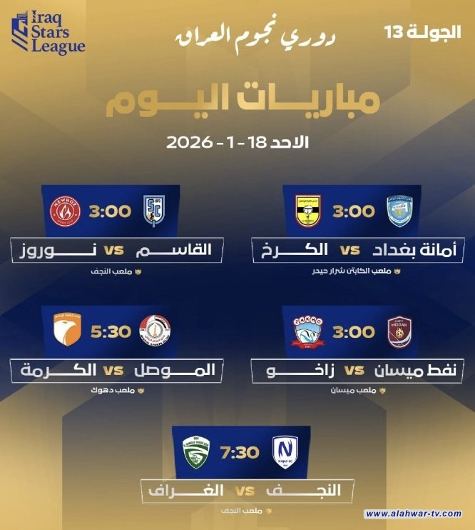 تتجه أنظار جماهير الكرة العراقية، اليوم الأحد، إلى ملاعب دوري نجوم العراق، حيث تُقام خمس مباريات ضمن منافسات الجولة الثالثة عشرة، تحمل في طياتها الكثير من الندية والإثارة.