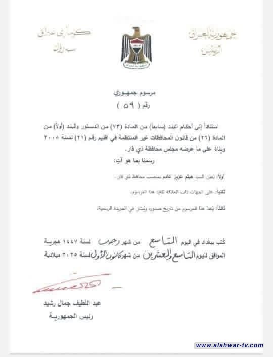 سلّم رئيس الجمهورية المرسوم الجمهوري إلى محافظ ذي قار الجديد، هيثم عزيز عادل، لتعيينه رسمياً في منصبه.