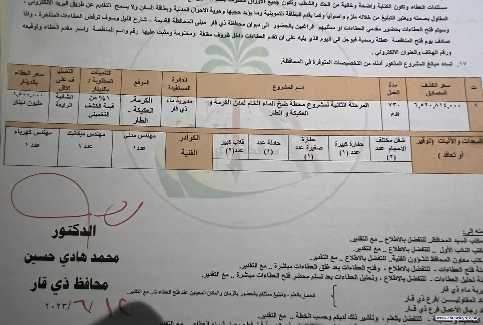 محافظ ذي قار يعلن توقيع مشروع (محطة الضخ لمدن العكيكة والكرمة والطار) كمناقصة عامة