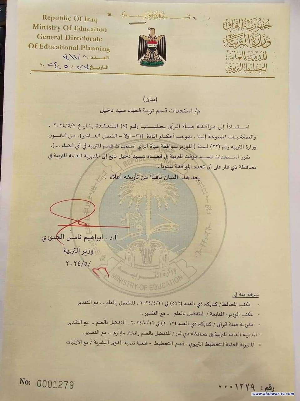 محافظ ذي قار : يعلن موافقة وزير التربية على استحداث قسم التربية لقضاء سيد دخيل