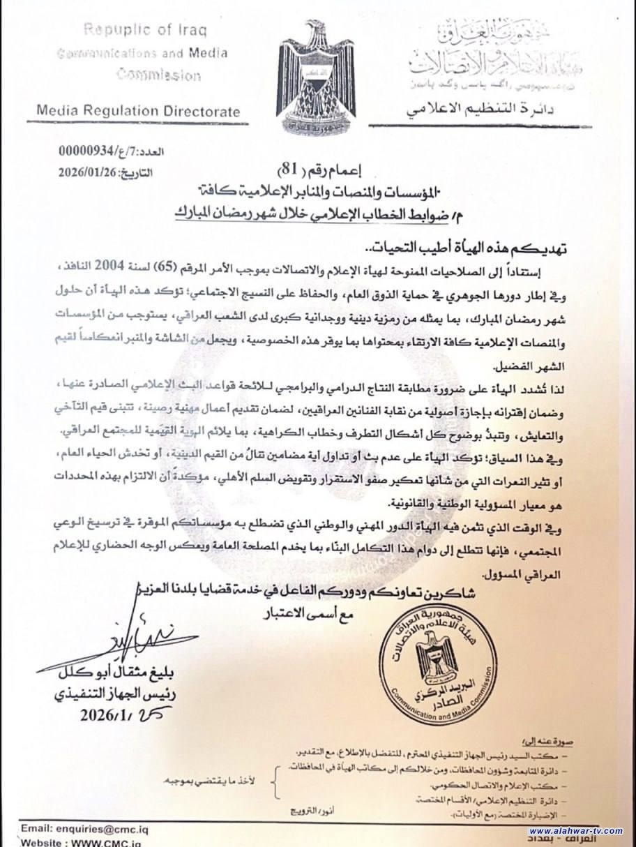اصدرت هيئة الاعلام والاتصالات، اليوم الثلاثاء، لائحة بضوابط الخطاب الإعلامي خلال شهر رمضان المبارك.