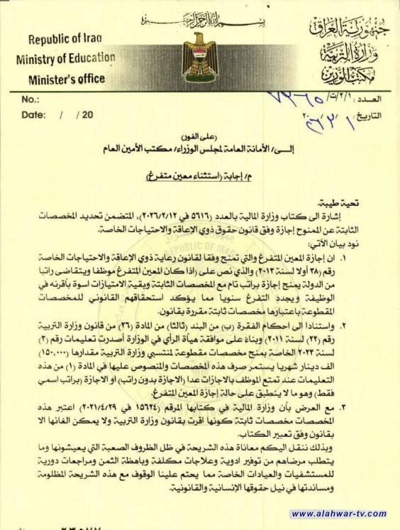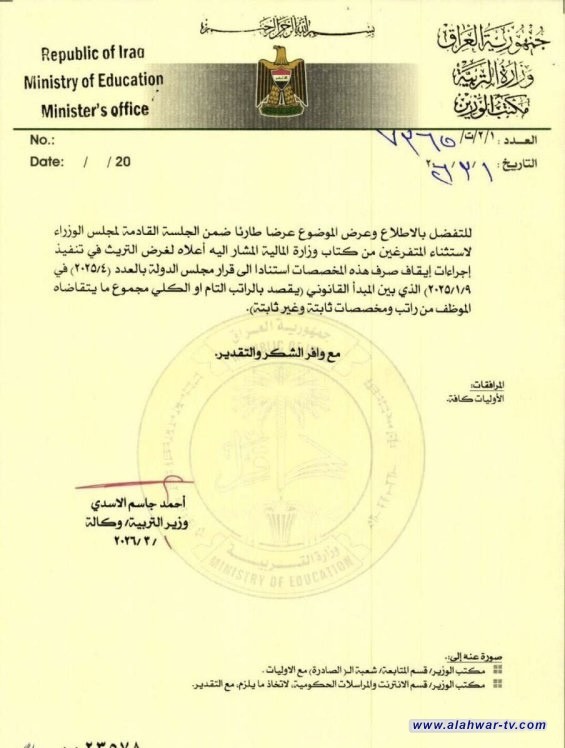 خاطب وزير التربية وكالة أحمد الأسدي، الأمانة العامة لمجلس الوزراء لاستثناء المعين المتفرغ من إيقاف المخصصات الثابتة.